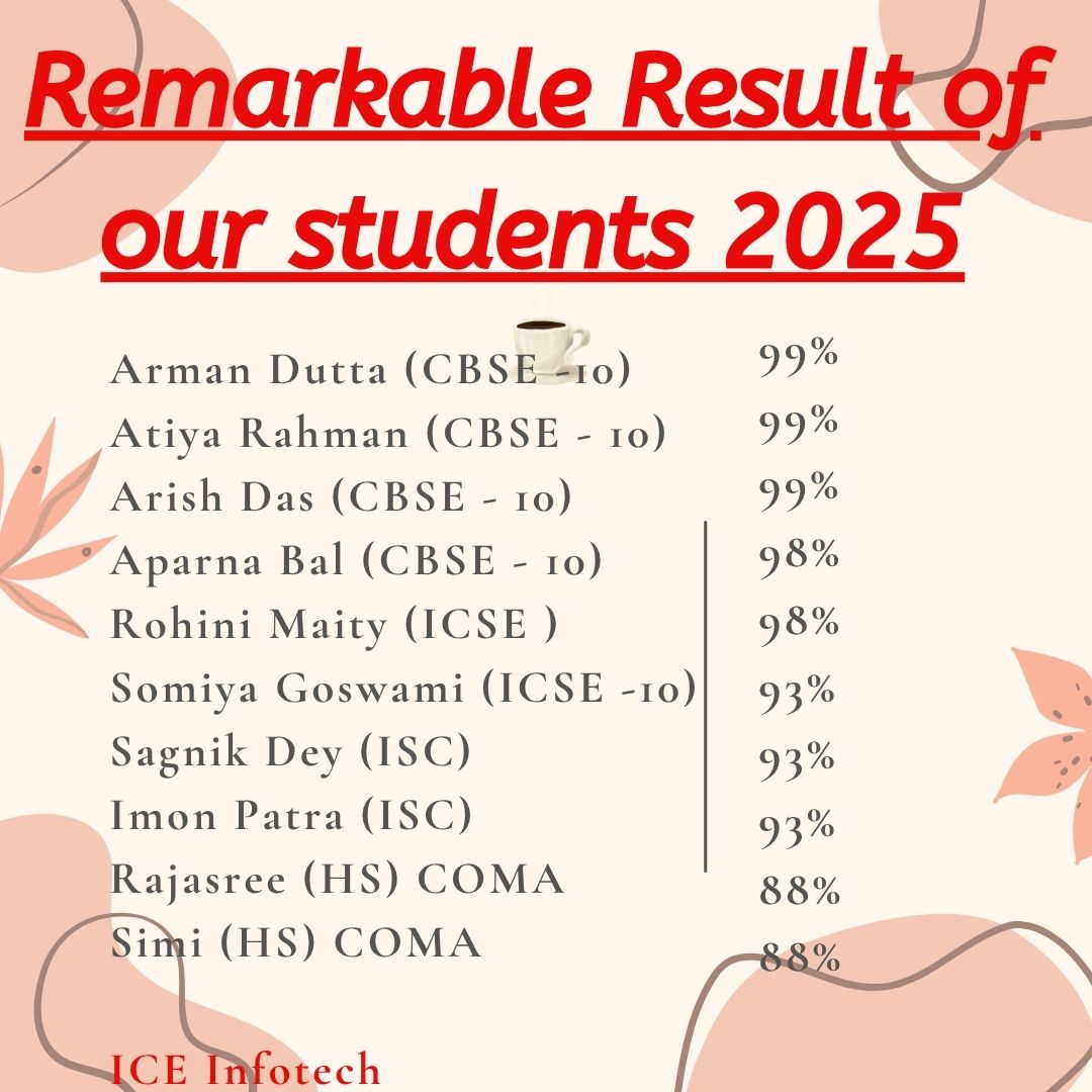 Top 2 in 2025 exams in Computer:     CBSE (Class 10): Atiya 99% (AI), Arman 99% (AI), Aparna 98% (AI) ICSE: Rohini 98% Somiya 93% ISC: Sagnik 93% Imon 93% HS: Rajasree 88%, Simi 88%